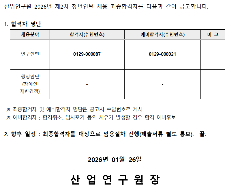 2026년 제2차 청년인턴 채용 최종합격자 공고
