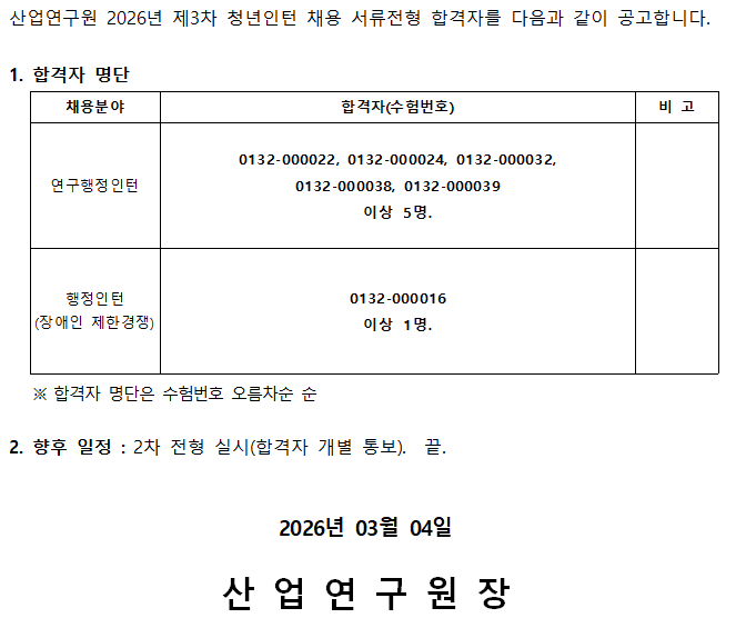 2026년 제3차 청년인턴 1차 전형(서류심사)합격자 공고