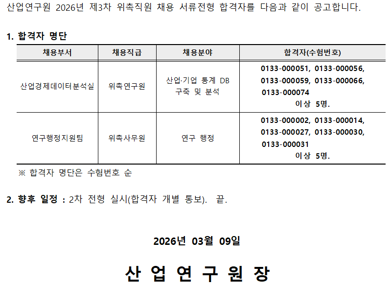 2026년 제3차 위촉직 채용 1차 전형(서류심사) 합격자 공고