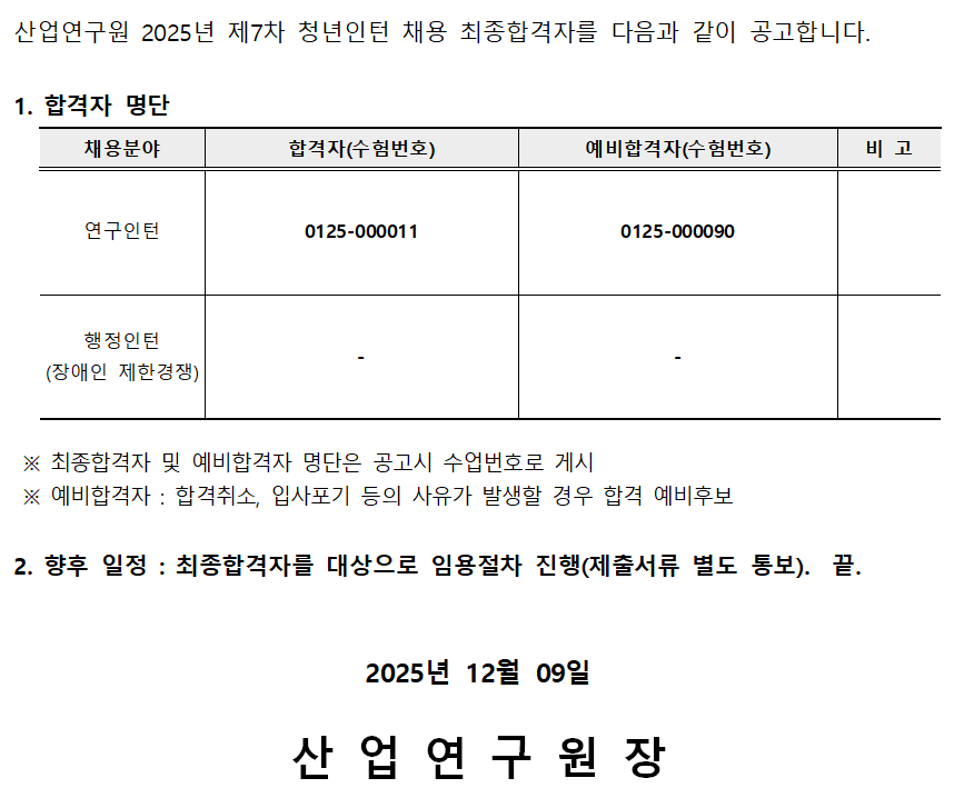 2025년 제7차 청년인턴 채용 최종합격자 공고 2025-12-09