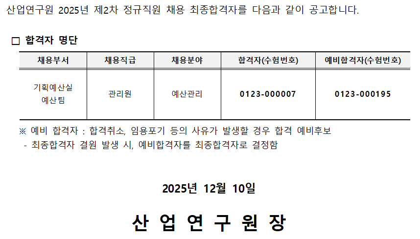 2025년 제2차 정규직 채용 최종합격자 공고 2025-12-10