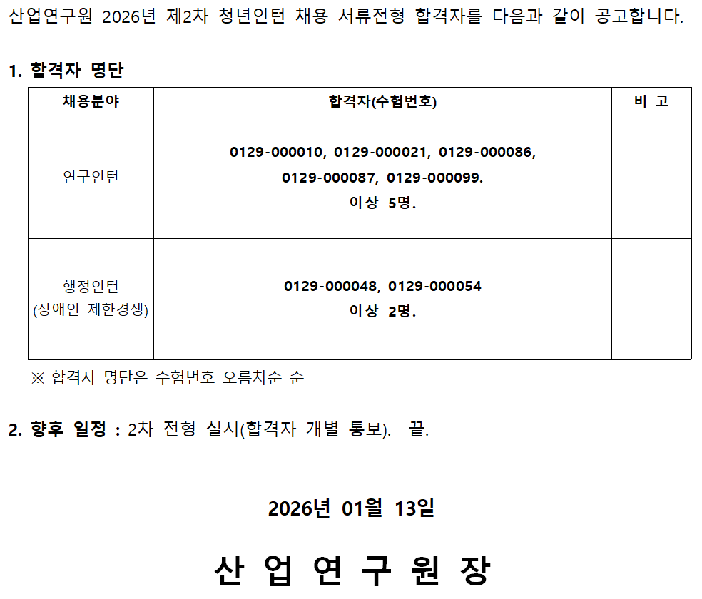 2026년 제2차 청년인턴 채용 1차 전형(서류심사)합격자 공고 2026-01-13