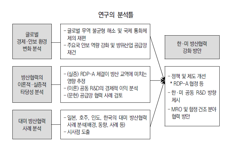 본 연구에서 방산협력이란 미국 국방부 산하의 국방획득대학교(Defense Acquisition University, DAU)의 정의에 따라 산업협력, 무기체계협력, 대외군사판매, 군수협력, 공동 연구개발, 해외 비교 시험 등을 포함한다. 본 연구는 문헌조사를 통해 글로벌 경제ㆍ안보 환경을 진단하고 정량데이터를 활용하여 한ㆍ미 방산협력의 이론적ㆍ실증적 타당성을 제시한다. 또한 주요국의 대미 방산협력 사례를 비교ㆍ분석하여 시사점을 도출하고 마지막으로 한ㆍ미 방산협력 강화 방안을 도출한다.