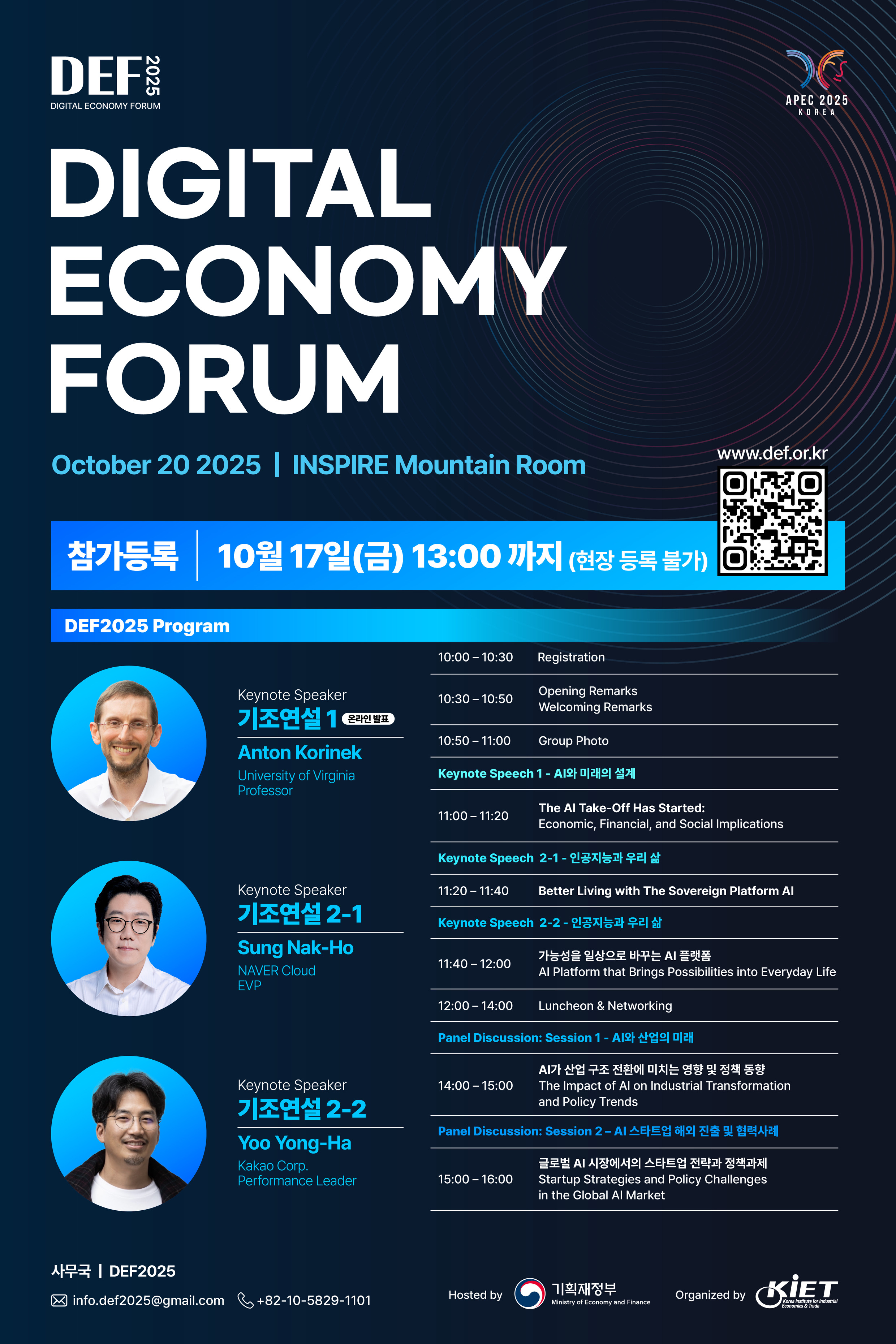 | 본문요약 | ○ 일시 : 2025.10.20.(월), 10:00-16:30 ○ 장소 : 인스파이어 리조트 마운틴룸 ○ 주최 및 공동주관 : 기획재정부, 산업연구원 ○ 홈페이지: https://def.or.kr/ |